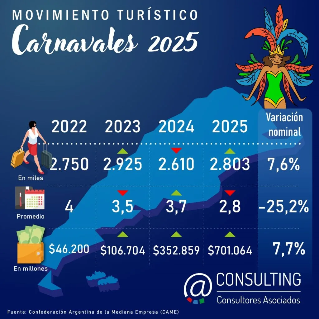 La Confederación Argentina de la Mediana Empresa (CAME) presentó su informe sobre el impacto del fin de semana extralargo de Carnaval 2025, destacando su rol como motor clave para el turismo en Argentina. Durante este período, 2,8 millones de turistas se movilizaron por distintos puntos del país, marcando un incremento del 7,6% respecto al año anterior.